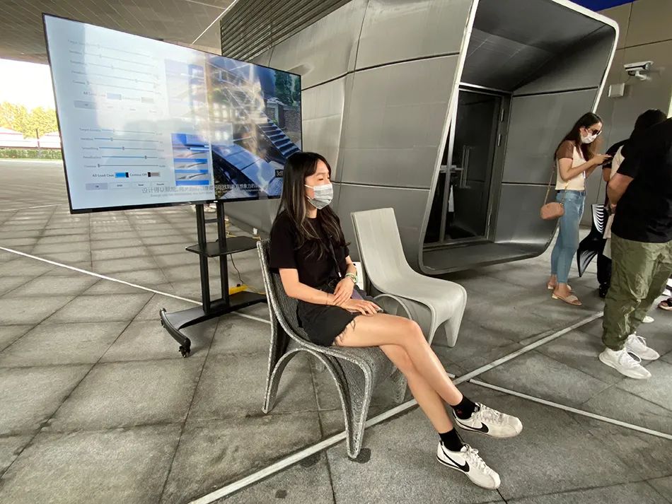 ☝现场工作人员在试坐元宇宙3D打印机设计制作的椅子