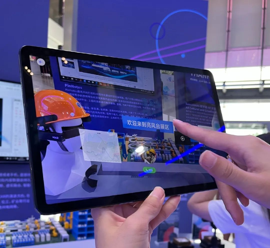 在亮风台展台,人们可以看到为工业而生的AR眼镜HiAR H100、AR远程通讯与协作平台HiLeia和AR“便利贴”与“记事本”PinNotes。用户可以通过AR眼镜或者手机,直接向物理世界中的参照物实时添加关联的虚拟内容,这些空间场景数据和虚拟内容数据会持久化保存到AR平台,之后可读出进行再次编辑、查看,为用户带来空间互联、虚实融合、智能交互的“沉浸式”体验。