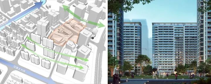 规划设计在建筑的布置上注重街坊边界的细部处理,沿道路的建筑山墙面的分缝处理,北侧及南侧的建筑排布,都尽量做到透、齐、富于变化。透是通透、透绿,使街坊的绿化与城市共享;齐是整齐,体现出韵律感,创造出较为和谐的沿路感受;富于变化则通过建筑的层层迭落、建筑布局的错动来丰富城市的天际线。立面采用横向构件元素,强调充满韵律、动感的城市生活。建筑底层局部架空,利用架空空间形成大量公共活动区。充分利用屋顶空间,设置花园、座椅等社交空间或小型运动区域,提高社区活力。