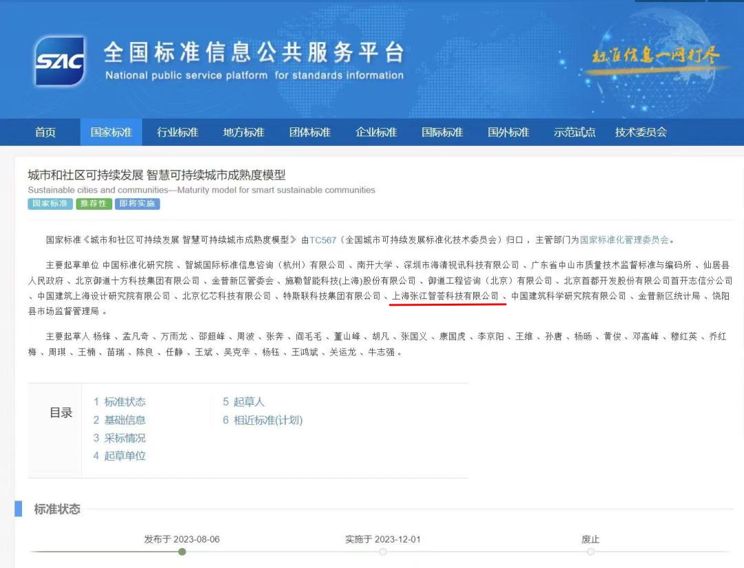 近期,由张江智荟参编的国家标准:GB/T42881-2023《城市和社区可持续发展 智慧可持续城市成熟度模型》正式发布。